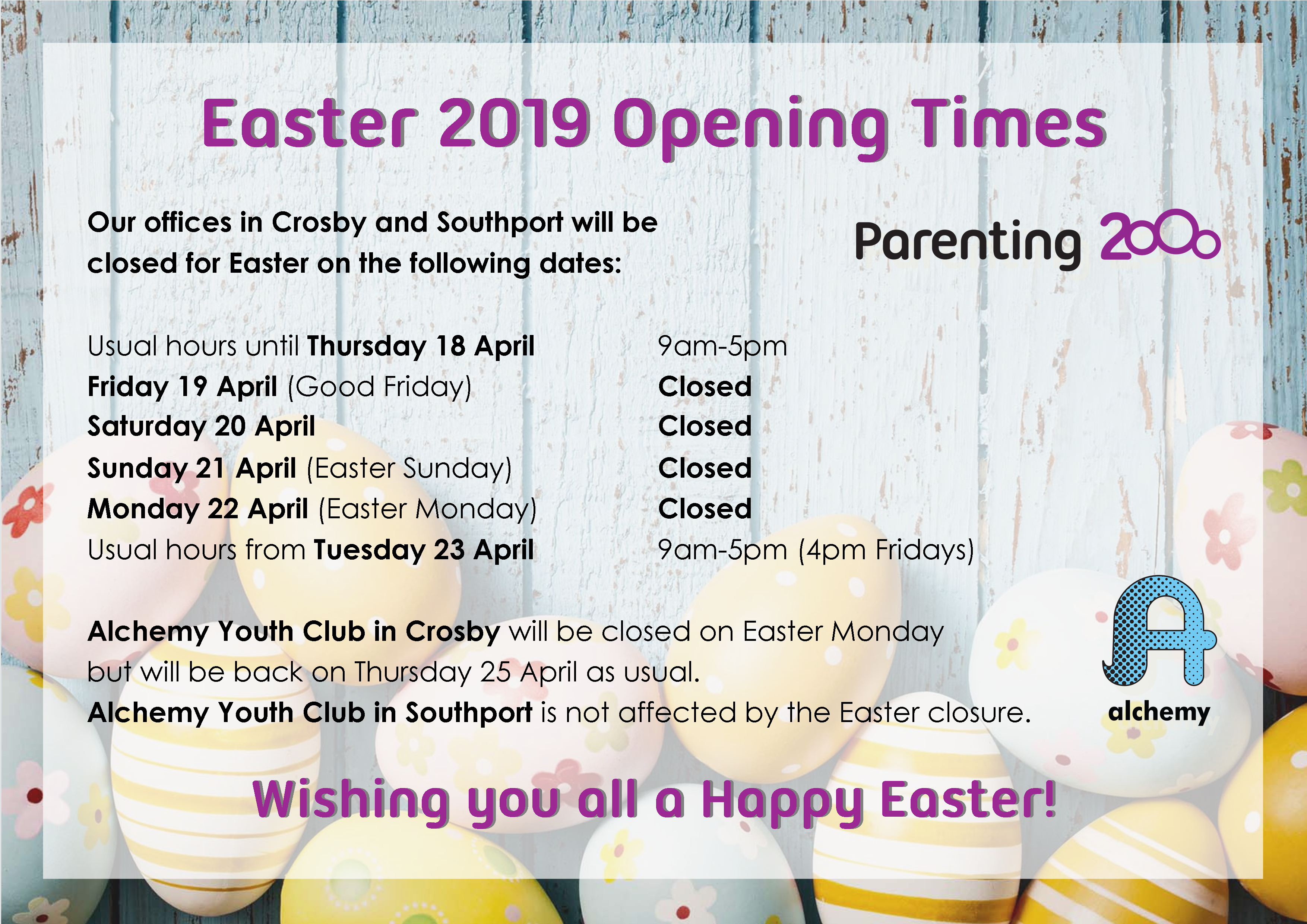 Alchemy Youth Club in Crosby will be closed on Easter Monday but will be back on Thursday 25 April as usual.