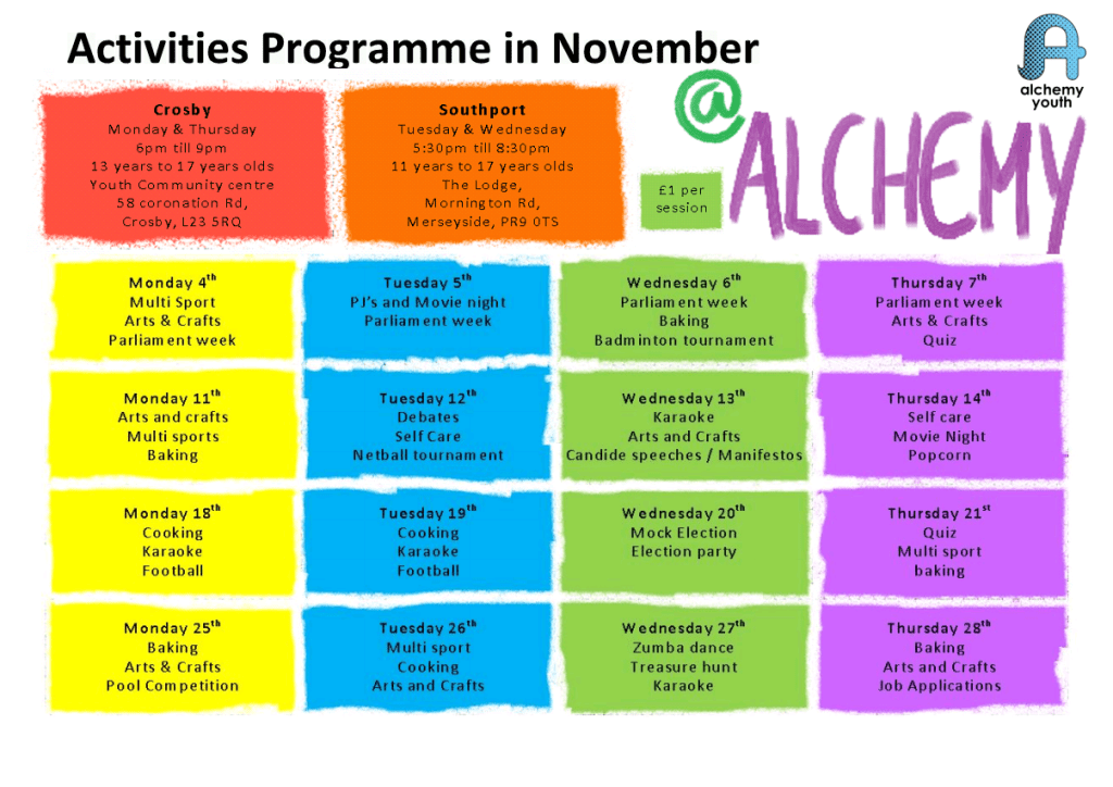 What’s on in November at Alchemy Youth 05/11/2019 / Robert Aughton Alchemy Junior in Crosby Junior Youth Club Plan (November)Download Alchemy Youth in Crosby & Southport Youth Club Plan (November)Download Share this: Click to share on Facebook (Opens in new window) Facebook Click to share on X (Opens in new window) X Click to share on X (Opens in new window) X Click to share on Bluesky (Opens in new window) Bluesky Click to share on WhatsApp (Opens in new window) WhatsApp Click to share on LinkedIn (Opens in new window) LinkedIn Click to email a link to a friend (Opens in new window) Email Like Loading...