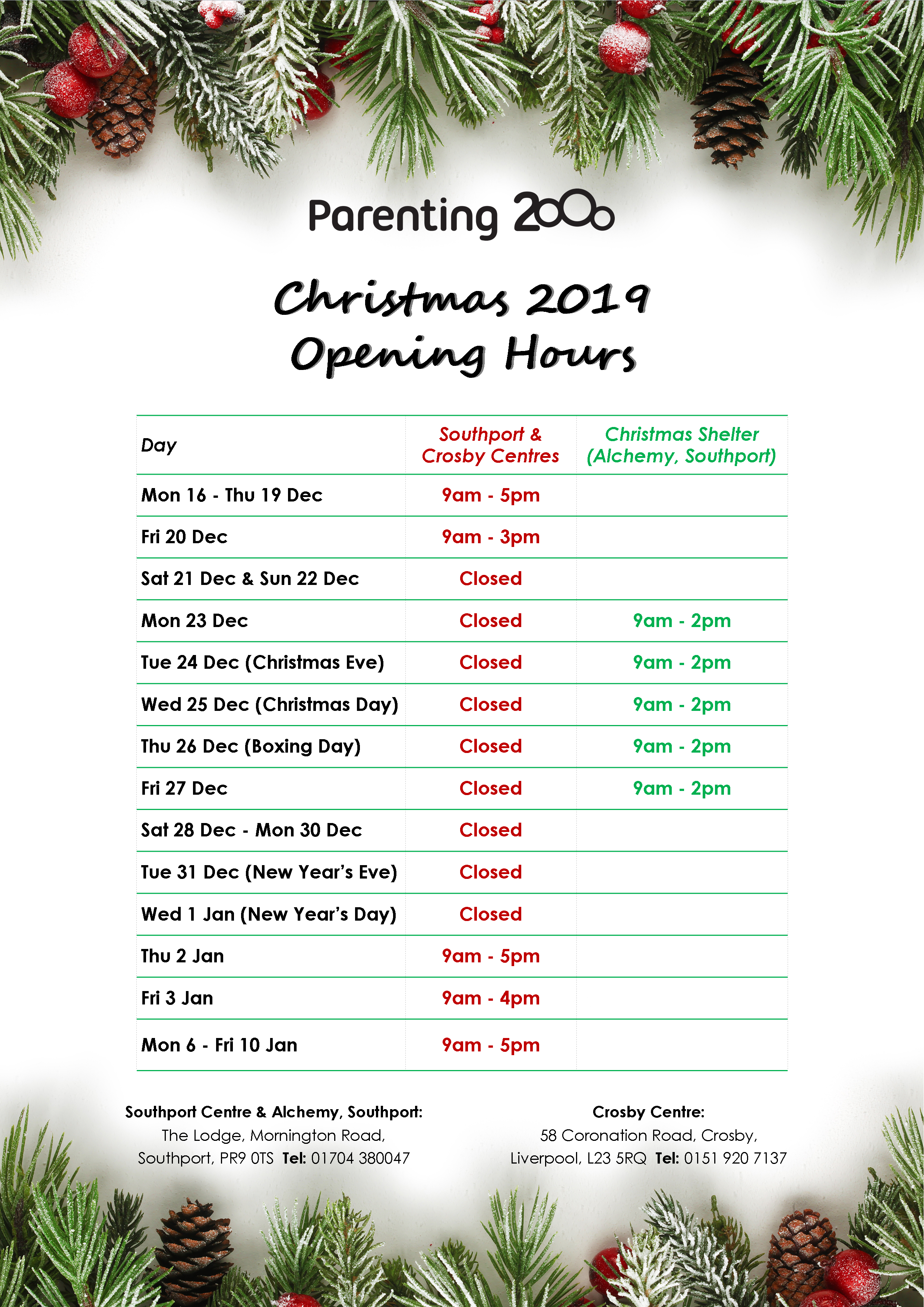 | Day | Southport & Crosby Centres | Christmas Shelter (Alchemy, Southport) |
