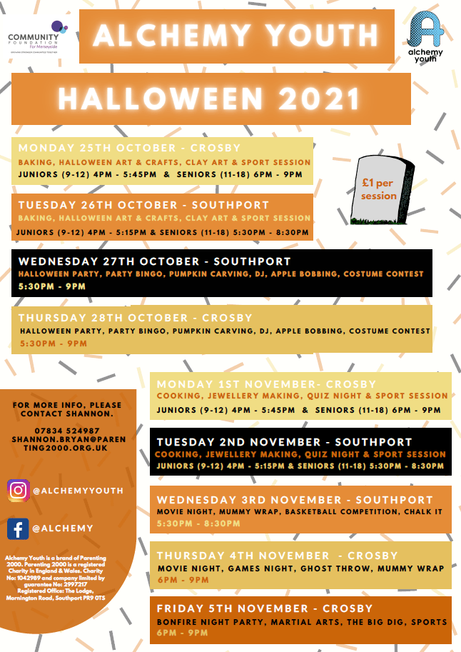 | Fri 5 Nov | 6pm – 9pm | Both (held at Crosby Centre) | Bonfire Night Party including Martial Arts, The Big Dig & Sports |