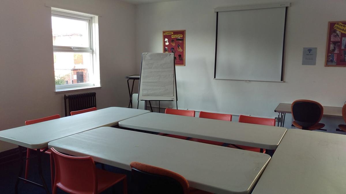 A bright room with flexible space ideal for meetings and training events. Room includes projector screen, white board and flip chart paper stand. With wash down tables, it also provides an ideal space for art classes. Access to fully fitted kitchen and toilets facilities.